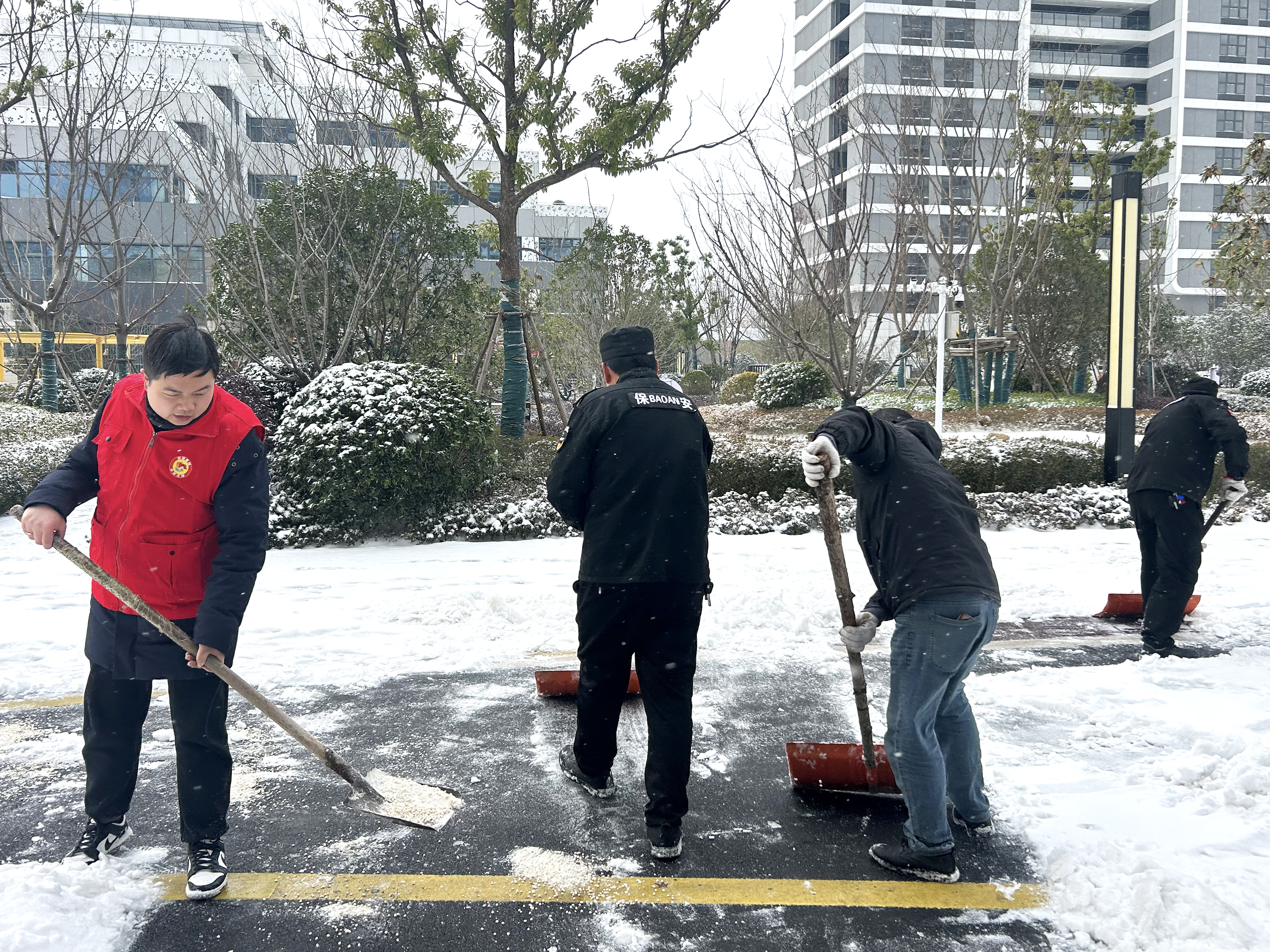 安居集团各承寓项目于雨雪到来之前率先启动应急预案,做好融雪剂及扫雪铲雪物资的储备,提前铺设防滑麻袋,易滑路段拉设警戒线,并张贴“小心地滑”温馨提示,同时加强园区各项安全巡查工作。